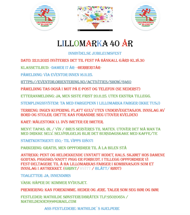 Så langt er det færre påmeldte på festen enn på en vanlig Tour of Lillomarka. Så vi oppfordrer alle til å bli med. Ordinær påmeldingsfrist er søndag 16. nov i Eventor: https://eventor.orientering.no/Activities/Show/6460
